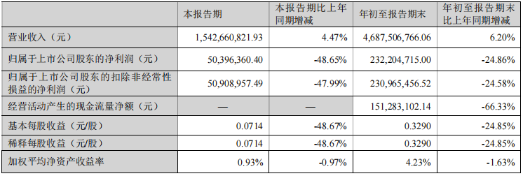 现金流方面,2025年1-9月,公司经营活动产生的现金流量净额1.51亿元,同比下降66.33%,主要因归属于上市公司股东的净利润及计提折旧额同比减少、存货与经营性应收余额增加占用资金、经营性应付余额减少导致支付材料款增加等因素综合影响。