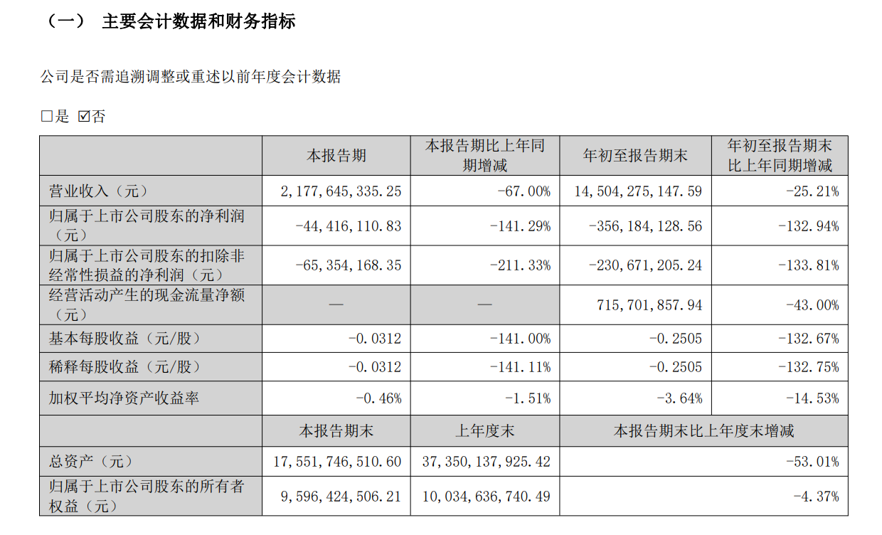 10月30日,发布2025年第三季度业绩报告。报告显示,第三季度公司实现营业收入21.78亿元,同比下降67%;归属于上市公司股东的净利润-4441.61万元,同比下降141.29%;扣除非经常性损益的净利润-6535.41万元,同比下降211.33%;