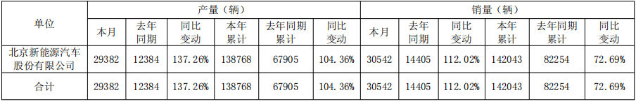 在产量方面,2025年10月北京新能源汽车股份有限公司产量为29382辆,去年同期产量为12384辆,同比变动幅度达137.26%;从累计数据来看,2025年累计产量为138768辆,去年同期累计产量为67905辆,累计同比变动104.36%,实现翻倍增长。