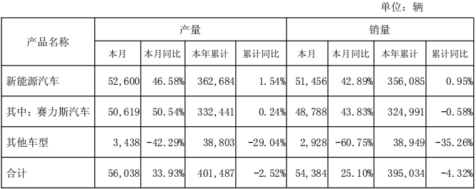 11月3日,赛力斯发布《2025年10月份产销快报》公告。10月新能源汽车产量为52,600辆,较去年同期同比增长46.58%;本年累计产量达362,684辆,累计同比增长1.54%。10月新能源汽车销量51,456辆,同比增长42.89%;本年累计销量356,085辆,累计同比增长0.95%,产销均保持同比正增长态势。