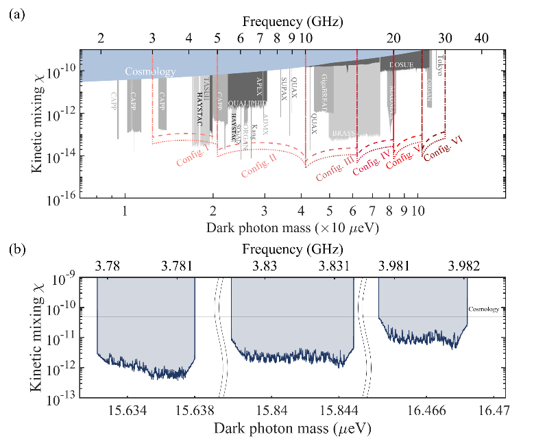 针对这一挑战,研究团队提出利用超导量子比特直接搜寻超轻暗物质的实验架构:利用微纳加工技术,在单个芯片上集成多个频率可调的超导量子比特,形成可扩展的暗物质搜寻架构。该架构可以实现对暗物质多能区同步开展高灵敏扫描探测(图a),从而有望解决测量范围与灵敏度难以兼顾的问题。研究团队设计制作了三比特超导量子芯片,可以同时对15.632-15.638、15.838-15.845及16.463-16.468µeV三个能区的暗光子进行搜寻,并给出了相应区间内最严格的暗光子-光子耦合界限,实验结果相较此前基于天文观测的界限提升了1–2个数量级(图b)。这项工作展示了超导量子比特在粒子物理领域的应用前景,为未来实现更宽质量区间、更高精度的暗物质探测提供了基础。