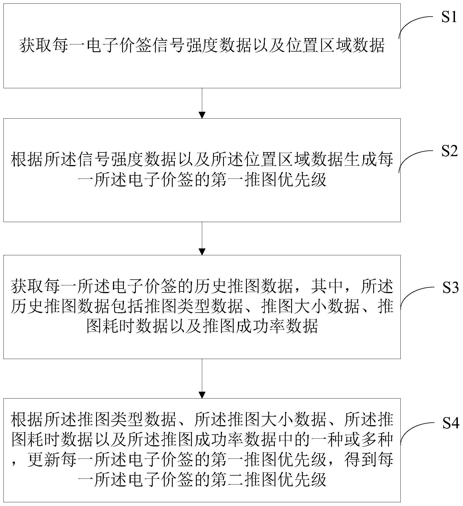 本发明公开了一种电子价签推图控制方法、设备及计算机可读存储介质,其中,该方法包括:通过获取每一电子价签信号强度数据以及位置区域数据;根据所述信号强度数据以及所述位置区域数据生成每一所述电子价签的第一推图优先级;获取每一所述电子价签的历史推图数据,其中,所述历史推图数据包括推图类型数据、推图大小数据、推图耗时数据以及推图成功率数据;根据所述推图类型数据、所述推图大小数据、所述推图耗时数据以及所述推图成功率数据中的一种或多种,更新每一所述电子价签的第一推图优先级,得到每一所述电子价签的第二推图优先级。实现了一种高效的电子价签推图控制方案,极大地提高了批量化推图场景下的推图进度,增强了产品力。