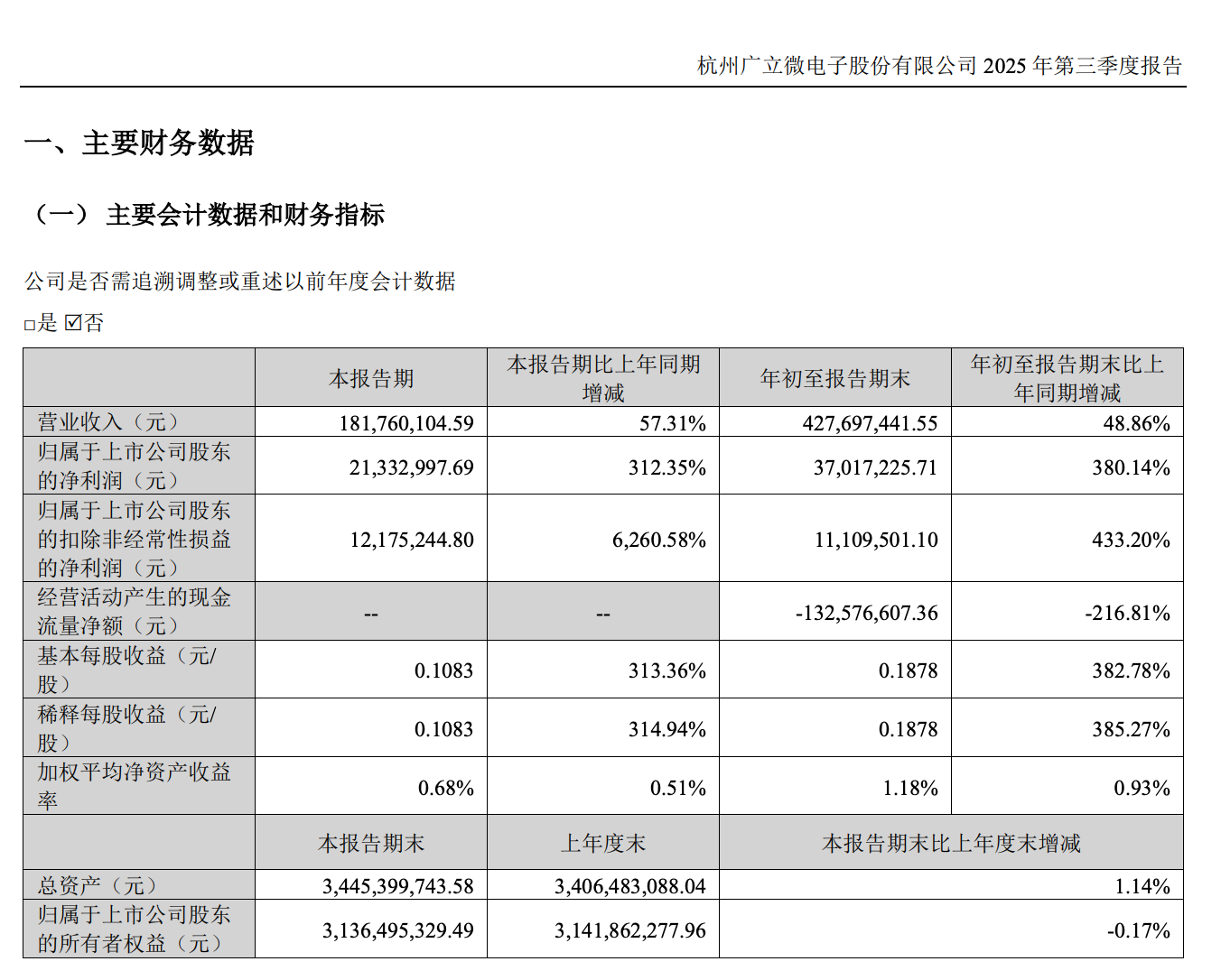 近日,广立微发布2025年三季报,公司第三季度营业收入1.82亿元,同比增长57.31%;净利润2133.30万元,同比增长312.35%。2025年前三季度营业收入4.28亿元,同比增长48.86%;净利润3701.72万元,同比增长380.14%。毛利润为1.2亿元,同比增长74.3%,毛利率为65.2%,较上年同期提升6.4%;扣除非经常损益之后的净利润为0.12亿元,较上年同期增长6260.6%。