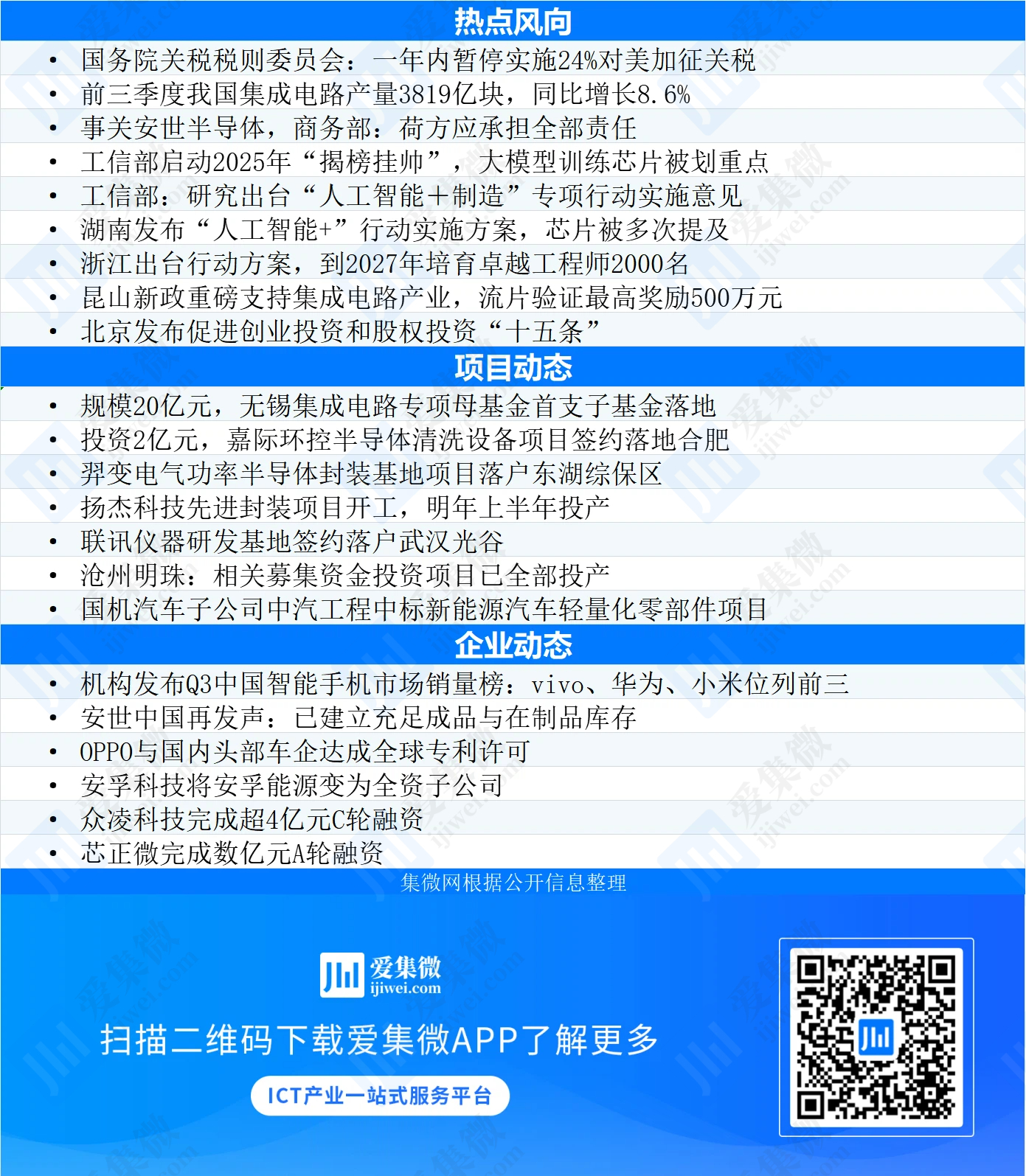 本周以来,国务院关税税则委员会称一年内暂停实施24%对美加征关税;工信部启动2025年“揭榜挂帅”,模型训练芯片被划重点;湖南发布“人工智能+”行动实施方案,多次提及芯片;安世中国再发声:已建立充足成品与在制品库存;20亿投资的无锡集成电路专项母基金首支子基金落地.....