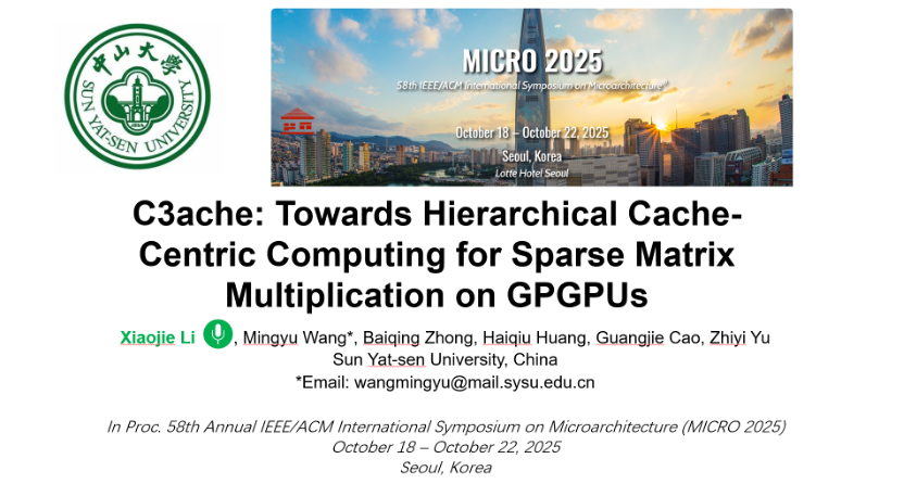 10月18日至22日,第58届国际微架构会议(The 58th Annual IEEE/ACM International Symposium on Microarchitecture, MICRO)在韩国首尔召开,中山大学微电子科学与技术学院虞志益教授领导的智能计算芯片团队提出的面向稀疏矩阵乘法的GPGPU存储系统架构相关研究工作被该会议录用并作口头报告。