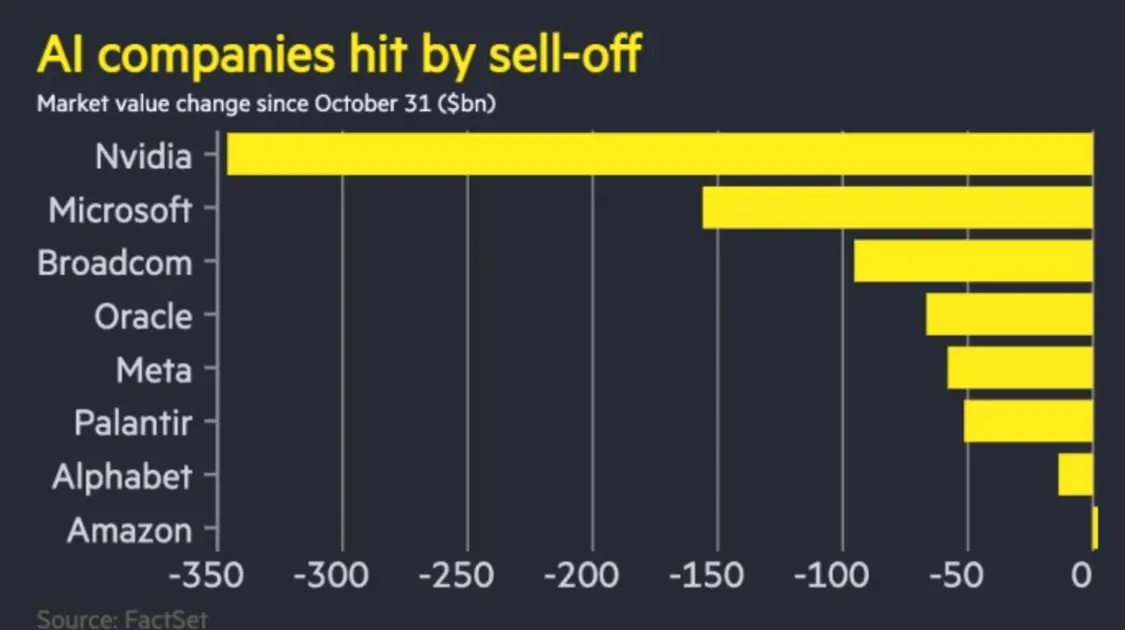 据《金融时报》报道,自上周五以来,与AI热潮密切相关的美国公司市值累计蒸发近1万亿美元,创下自特朗普4月宣布“解放日”关税以来科技股表现最差的一周。