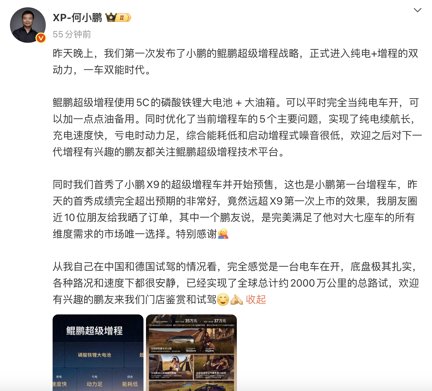 11月7日,小鹏汽车董事长何小鹏发文称,昨天晚上,我们第一次发布了小鹏的鲲鹏超级增程战略,正式进入纯电+增程的双动力,一车双能时代。