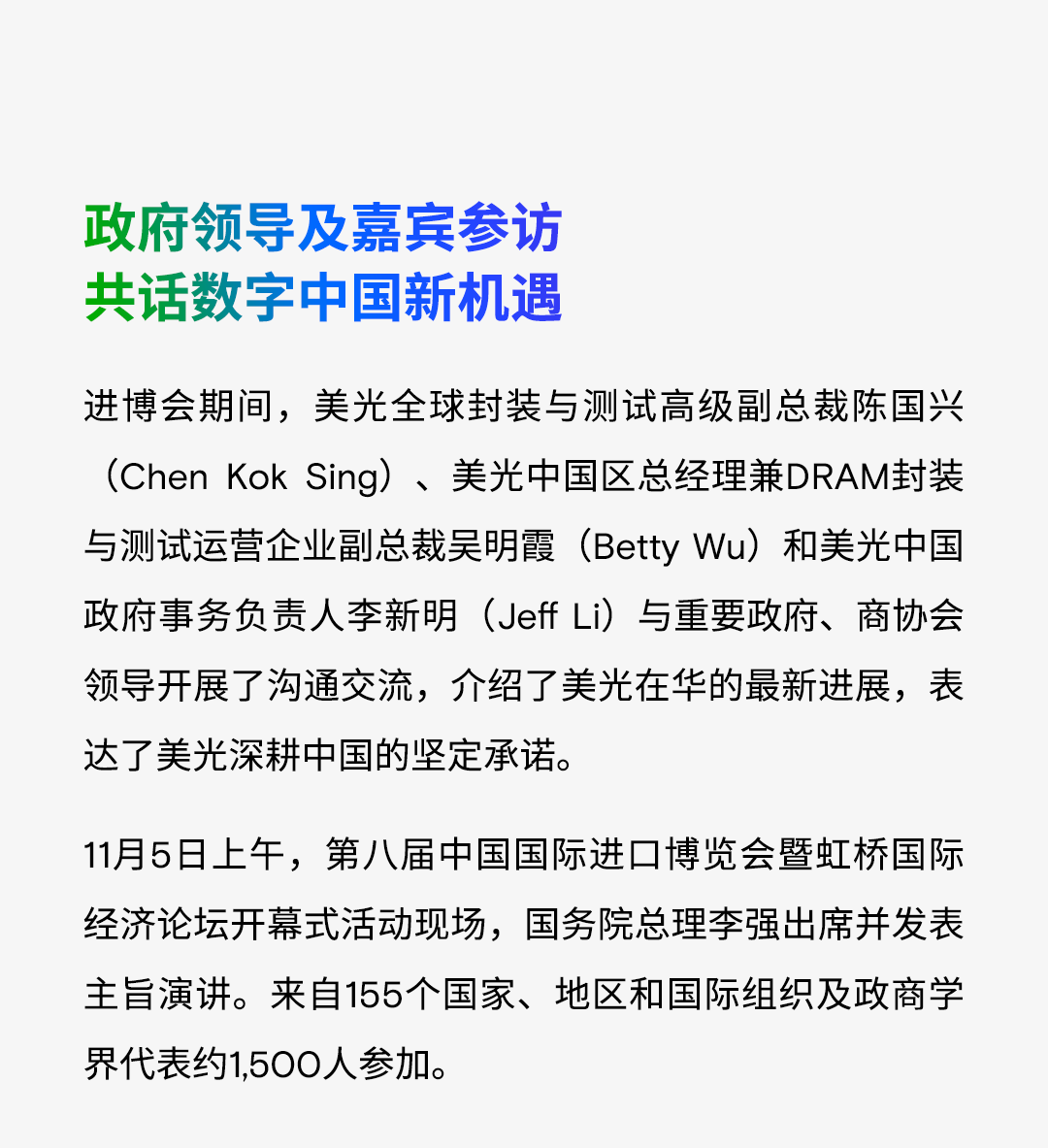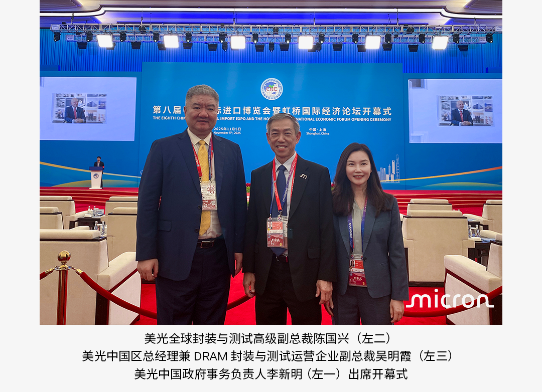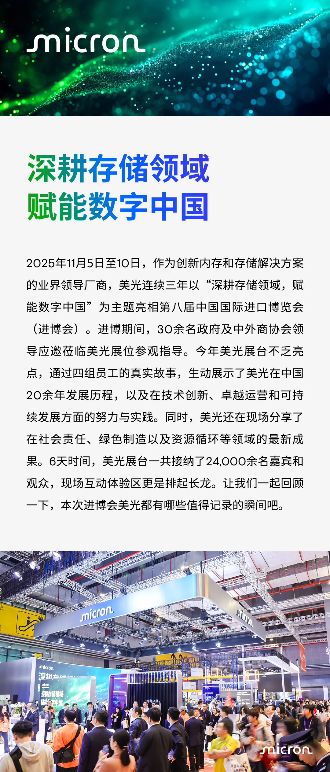 美光连续三年进博之旅,本届高光时刻全记录 作者: 爱集微 11-12 14:06 相关舆情 AI解读 生成海报 来源:Micron美光科技 #美光# #进博会# 评论 收藏 点赞 1.4w 责编: 爱集微 来源:Micron美光科技 #美光# #进博会# 收藏 点赞 分享至: 微信扫一扫分享 THE END 相关推荐 美光宣布退出消费级存储器业务,专注AI及数据中心市场 云巨头抢签内存产能,2026年或将持续面临短缺 日经:美光将在日本广岛建新工厂 日本再砸70亿美元,扶植“旗舰项目”Rapidus 美光出货车用UFS4.1:解锁快速、安全、可靠的智能出行体验 美光科技将在韩国大举招聘 争抢HBM人才 +关注 爱集微 微信: 邮箱:laoyaoba@gmail.com 12.1w文章总数 12012.5w总浏览量 最近发布 任正非最新讲话:未来算力过剩,当前强调“应用”领先 1小时前 海南省政府党组成员、副省长杨国强一行调研芯原海南 1小时前 芯联绍兴集成电路产业基金成立,芯联资本担任基金管理人 2小时前 股票代码688795!摩尔线程正式挂牌,科创板迎来首家国产GPU公司 2小时前 【大单】爆满!英伟达手握3.54万亿GPU大单 5小时前 获取更多内容 最新资讯 格威半导体:以车规BMS AFE芯片突破国际垄断,实现国产化替代新征程 12分钟前 从技术破局到市场主导:通嘉科技以真空泵核心技术打通高端制造重要环节 15分钟前 打造“安防+穿戴”双增长曲线,安凯微拟3.26亿控股思澈科技 5小时前 合众新能源启动共益债招募,拟融资不超1亿元用于重整存续 48分钟前 机构:Q3拉美智能手机市场同比增长1%,三星、小米、摩托罗拉位列出货量前三 56分钟前 任正非最新讲话:未来算力过剩,当前强调“应用”领先 1小时前