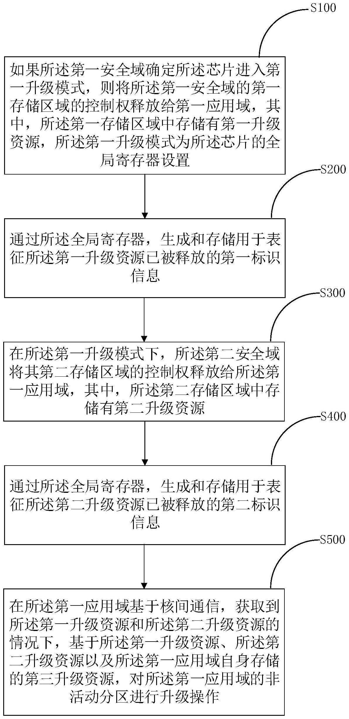 本申请公开了一种芯片的硬件域升级方法、装置、芯片及车辆,该方法应用于芯片,包括:如果第一安全域确定芯片进入第一升级模式,将第一安全域的第一存储区域的控制权释放给第一应用域,第一存储区域中存储有第一升级资源;生成和存储用于表征第一升级资源已被释放的第一标识信息;在第一升级模式下,第二安全域将其第二存储区域的控制权释放给第一应用域,第二存储区域中存储有第二升级资源;如果第一应用域基于核间通信获取到第一升级资源和第二升级资源,基于第一升级资源、第二升级资源以及第一应用域自身存储的第三升级资源,对第一应用域的非活动分区进行升级操作。该方法实现了部分硬件域的升级。