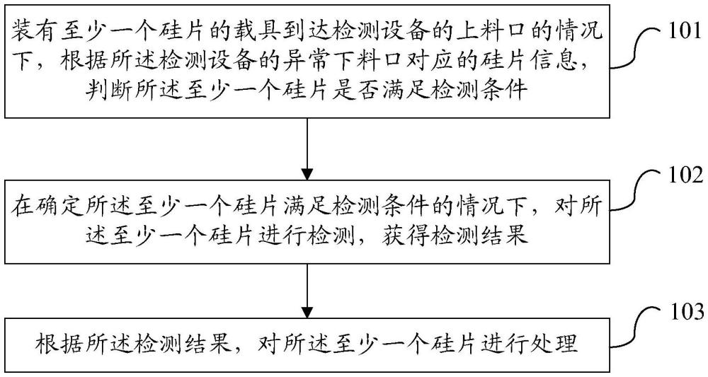 本发明提供了一种硅片的检测控制方法、装置、控制设备、程序产品及介质,属于半导体技术领域。包括:在装有至少一个硅片的载具到达检测设备的上料口的情况下,根据所述检测设备的异常下料口对应的硅片信息,判断所述至少一个硅片是否满足检测条件;在确定所述至少一个硅片满足检测条件的情况下,对所述至少一个硅片进行检测,获得检测结果;根据所述检测结果,对所述至少一个硅片进行处理。本发明的技术方案能够对异常硅片进行及时地自动处理,避免了异常硅片需要人工进一步分类而导致的检测效率低的问题。