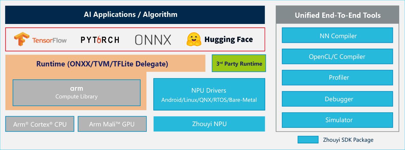 全面的系统与异构兼容:支持Android、Linux、RTOS、QNX等多种操作系统,并通过TVM/ONNX实现SoC异构计算,高效调度CPU、GPU、NPU等计算资源。