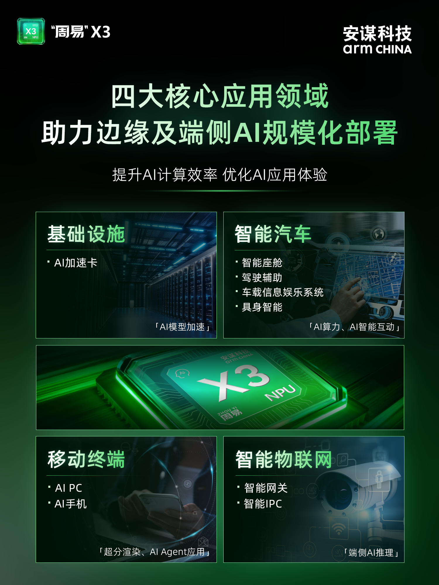 赋能AI加速卡、智能座舱、驾驶辅助、车载信息娱乐系统、具身智能、AI PC、AI手机、智能网关、智能IPC等场景,为千行百业的AI应用提供全面而深入的算力支持