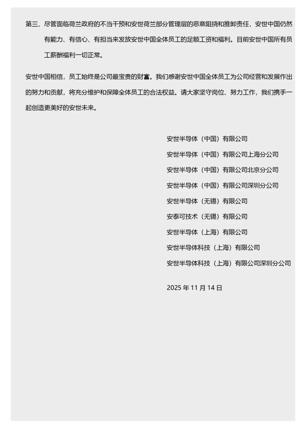 尽管面临内外部压力,安世中国在信中明确向员工保证,公司有能力和信心发放全体员工的足额工资和福利,并强调目前所有员工薪酬福利一切正常。安世中国以此安抚员工,并呼吁大家坚守岗位。
