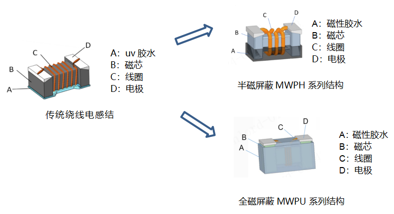 传统绕线电感表面涂覆UV胶水,为开磁路结构,只起到保护铜线,便于客户贴片吸取作用。而绕线片式电感MWPH系列采用磁性胶水半包覆封装,在固定线圈的同时进一步减少漏磁,减少了TWS耳机底噪问题 。MWPU系列增加二次点胶工艺,将线圈全包覆,避免了磁力线外泄风险,进一步提升EMC特性。