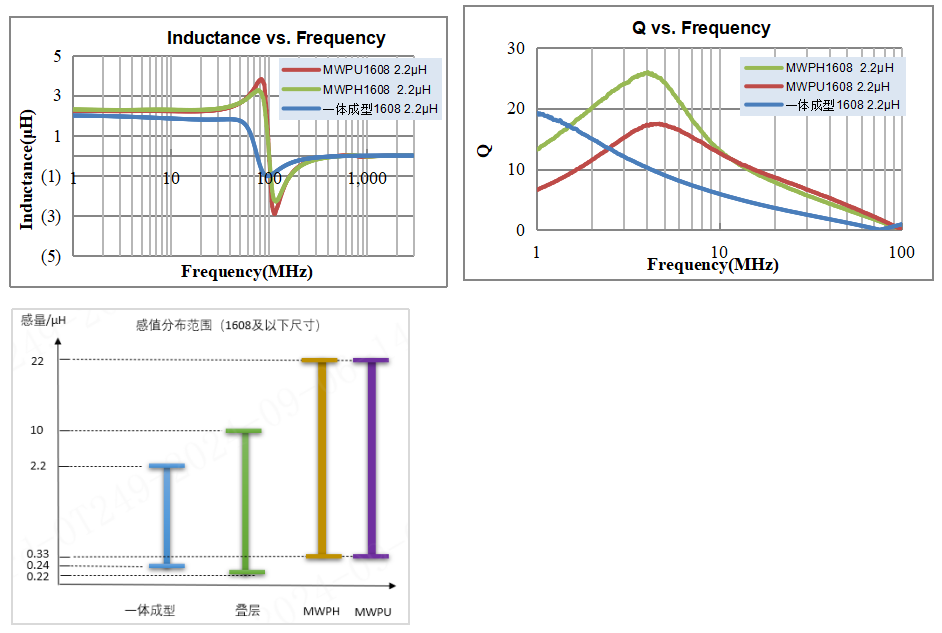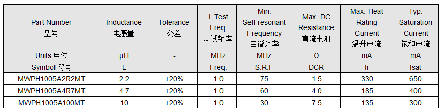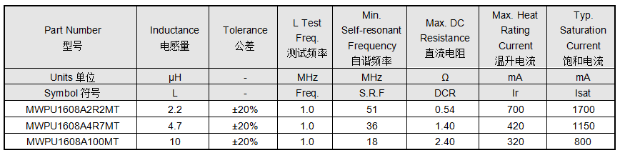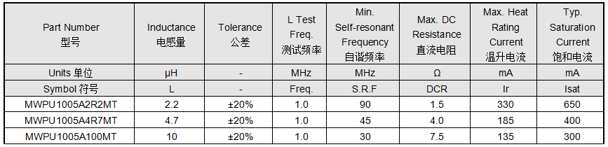 绕线片式功率电感MWPH/MWPU系列自谐频率更高,可满足更高频电路应用;高频下Q值更高,损耗相对较小;更宽的感量分布范围(0.33μH~22μH)。