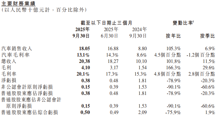营收方面,第三季度总营收同比翻倍,达人民币203.8亿元(28.6亿美元),较2024年同期的101亿元增长101.8%,较2025年第二季度的182.7亿元环比增长11.5%。其中,汽车销售收入为人民币180.5亿元(25.4亿美元),同比增长105.3%,环比增长6.9%,主要得益于新车型交付量的持续增加;服务及其他收入为人民币23.3亿元(3.3亿美元),同比增长78.1%,环比增长67.3%,核心驱动力来自售后服务收入增长及技术研发服务收入的显著提升。