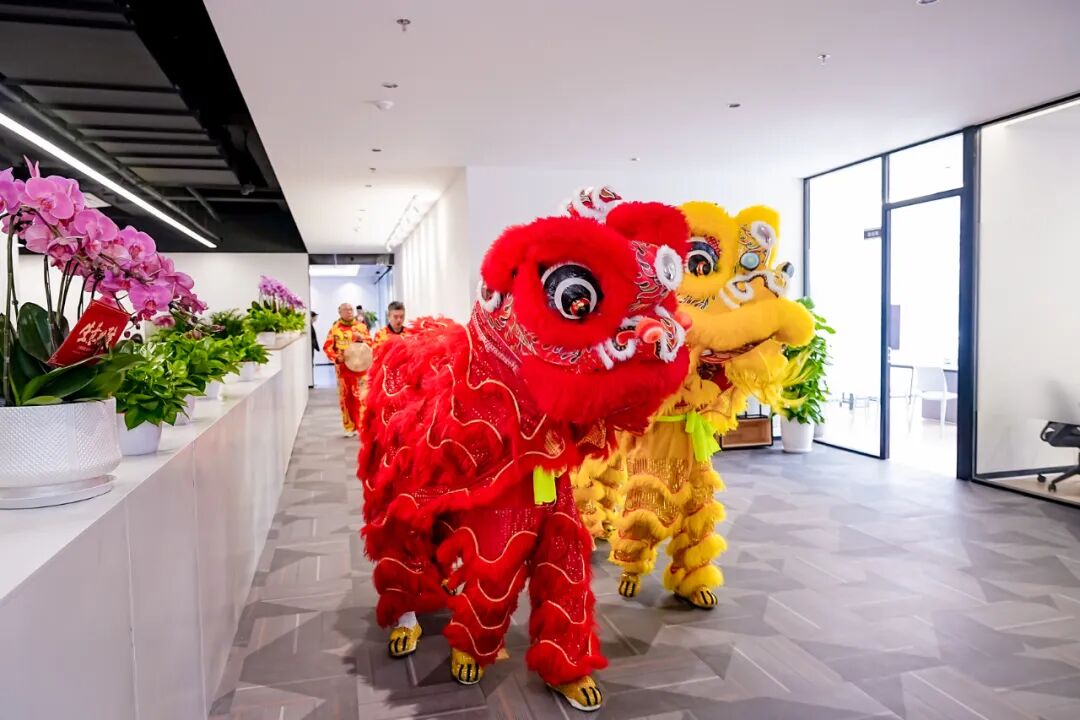点睛完毕,两头生龙活虎的金狮伴随着激昂的锣鼓声,引领来宾巡游新址,将福气与活力遍布每个角落,寓意着泓浒未来在新家园中生机勃勃,火力全开。