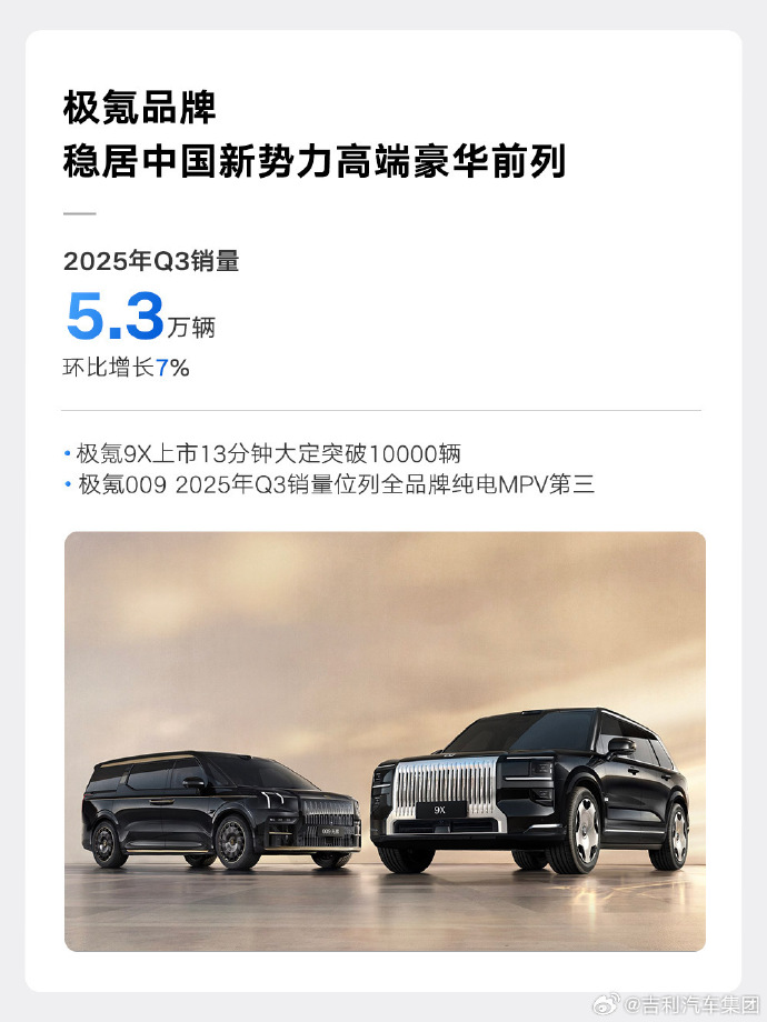 其中,极氪品牌2025年Q3销量5.3万辆,环比增长7%;领克品牌8.7万辆,环比增长7%。