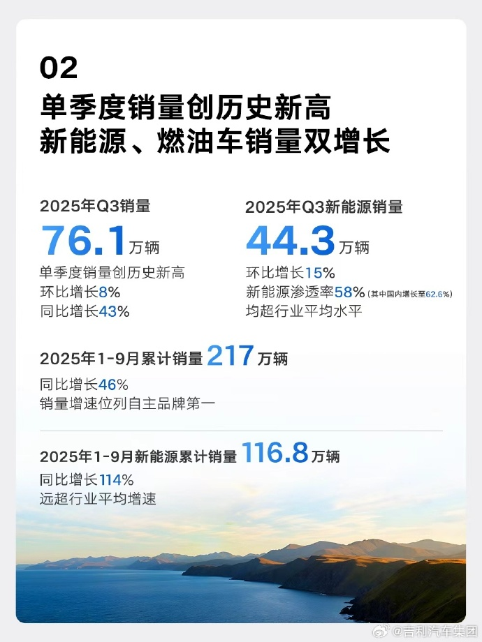 吉利汽车2025年Q3收入892亿元,同比增长27%