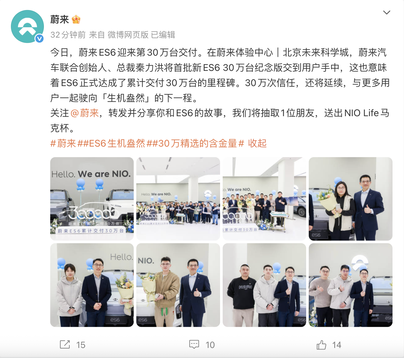 11月18日,蔚来汽车联合创始人、总裁秦力洪将首批新ES6 30万台纪念版交到用户手中,这也意味着ES6正式达成了累计交付30万台的里程碑。