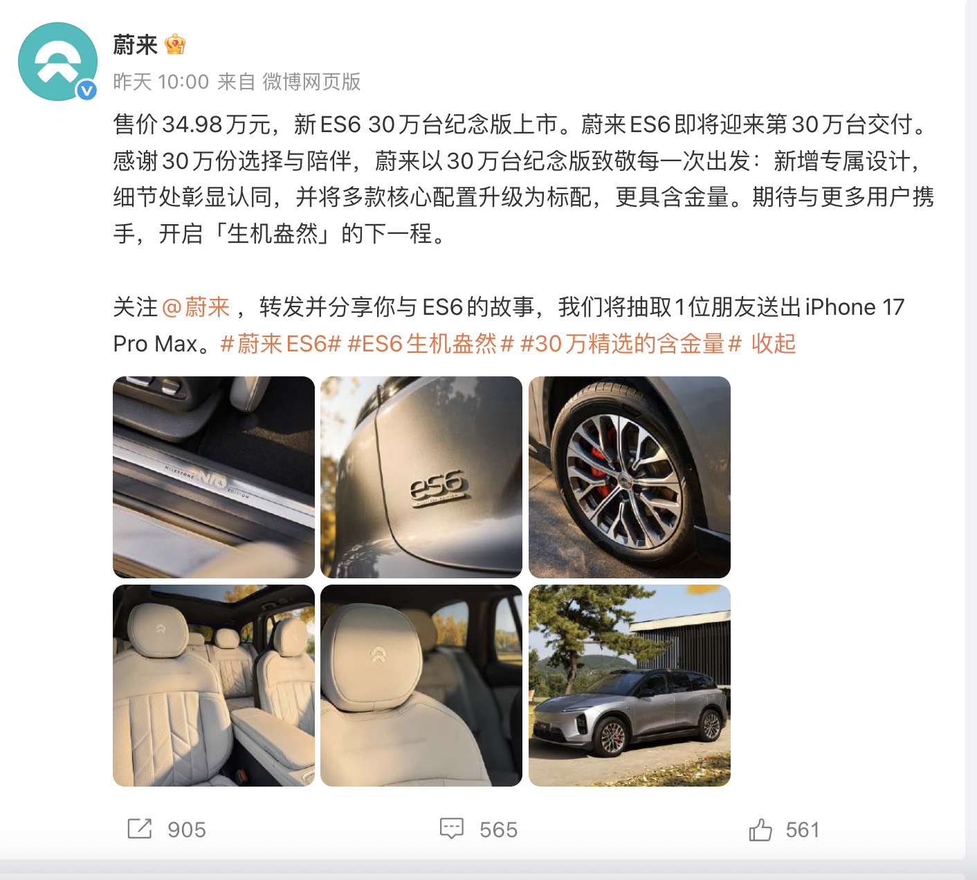 昨日,新ES6 30万台纪念版上市,售价34.98万元。新增“Milestone Edition”铭牌、Moon套件等专属设计,并标配20英寸织雪轮圈、NOMI Mate 3.0、女王副驾等高阶配置。
