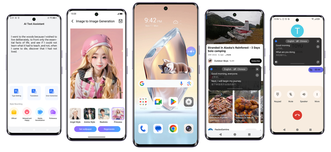 聚焦高频需求,实用落地。围绕市场热门方向与用户核心需求,打造AI图片创作、多语言翻译、通话摘要、文本助手等功能矩阵。其中,多语言AI翻译功能针对性解决跨国沟通痛点,支持AI文本翻译、AI语音翻译、AI实时字幕,满足商务洽谈、涉外影音观看等多元需求。
