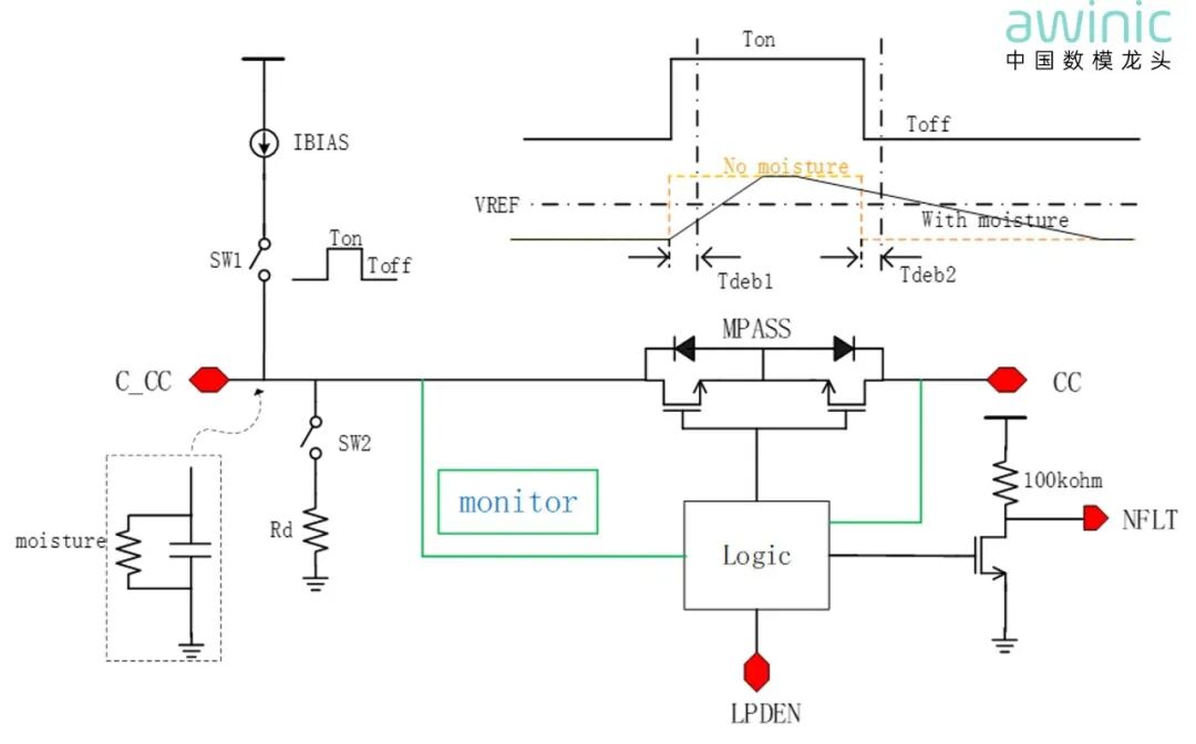 艾为的PD PHY系列芯片内部集成拥有专利保护的硬件水汽检测电路,并将其融入到toggle过程中,其原理结合下图解释: