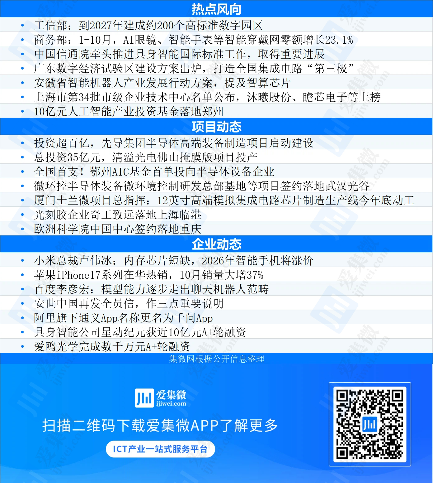 本周以来,商务部数据显示1-10月智能穿戴产品网零额增长23.1%;中国信通院牵头推进具身智能国际标准工作;广东提出打造全国集成电路“第三极”,安徽发布智能机器人产业发展行动方案;小米预警2026年手机或因内存芯片短缺涨价,安世中国回应内部争议……