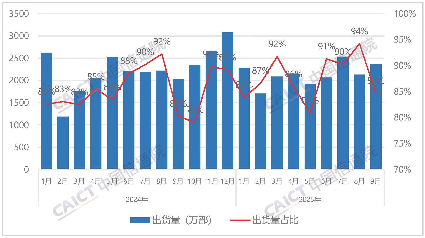 (文/罗叶馨梅)11月20日,中国信息通信研究院发布《2025年9月国内手机市场运行分析报告》称,当月国内手机市场出货量为2793.1万部,同比增长10.1%。其中,5G手机出货量2410.6万部,同比增长8.0%,在整体出货中的占比达86.3%,5G机型仍是市场主力。