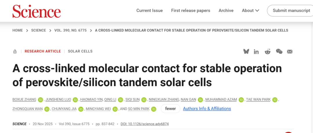 为进一步突破单结钙钛矿太阳电池的Shockley-Queisser理论极限,钙钛矿/晶硅叠层技术被视作实现更高效率的关键路径。然而,钙钛矿/晶硅叠层电池中关键的自组装空穴传输层在老化过程中易出现结构有序性衰退,严重制约了叠层电池的长期稳定性。最近,团队基于在单结钙钛矿太阳电池领域的技术积累,针对该问题提出原位构筑交联自组装空穴传输层的新策略;该方法在稳定空穴传输层结构的同时,有效增强了钙钛矿界面的钝化效果与晶体薄膜质量;成功制备出光电转换效率超过34%的钙钛矿/晶硅叠层太阳电池,在65 ℃高温环境中连续工作1200小时后,效率仍保持初始值的96%以上;该研究为提升自组装空穴传输层及钙钛矿/晶硅叠层太阳电池的稳定性开辟了新途径。北京时间11月21日,该研究成果以“A cross-linked molecular contact for stable operation of perovskite/silicon tandem solar cells”为题发表于国际著名学术期刊《科学》(Science)。