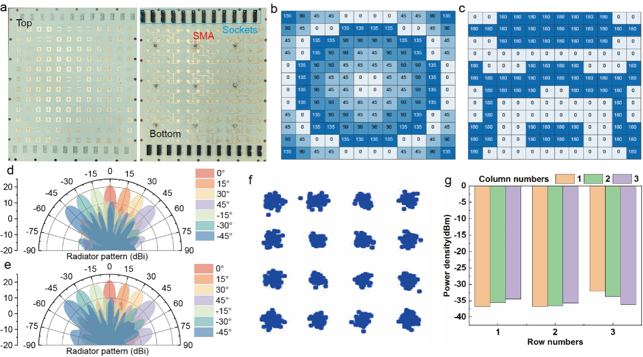 电磁多维融合幅散可重构智能超表面(a)阵列原型,(b)辐射模式初始相位,(c)30°波束扫描编码,辐射模式下(d)E面和(e)H面波束扫描特性,(f)16QAM传输星座图,(g)接收模式无线能量收集。