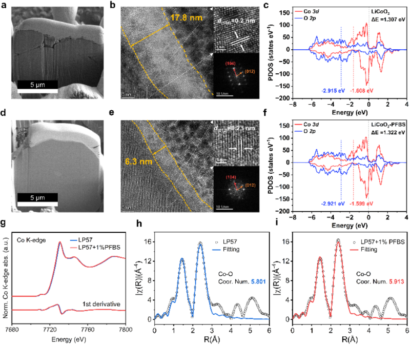 为深入揭示PFBS提升高压稳定性的内在机理,研究团队对循环后的正极进行了多尺度表征。扫描电镜(SEM)结果显示,基准电解液体系中LCO颗粒内部出现明显微裂纹,而在PFBS体系中,颗粒结构完整、裂纹显著减少。高分辨透射电镜(HRTEM)进一步揭示:PFBS体系形成的界面膜(CEI)厚度仅约6.3 nm,远低于基准电解液的17.8 nm,且膜层致密、连续,能起到更好的保护作用。同步辐射X射线吸收精细结构(XANES)分析显示,PFBS体系中LCO的Co-O配位数更高,说明正极材料的晶格结构在多次循环之后仍保持完整。
