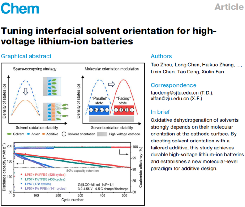 近日,上海交通大学中英国际低碳学院、绿色造纸与资源回收国家重点实验室邓涛副教授团队,在高电压锂电池电解液设计方面取得重要突破。该研究成果以“Tuning interfacial solvent orientation for high-voltage Lithium-ion batteries”为题,发表于国际顶级期刊Chem(Cell Press化学类子刊)。论文第一作者为低碳学院一年级博士生周涛,邓涛副教授与浙江大学范修林研究员为论文共同通讯作者,上海交通大学为论文第一完成单位。