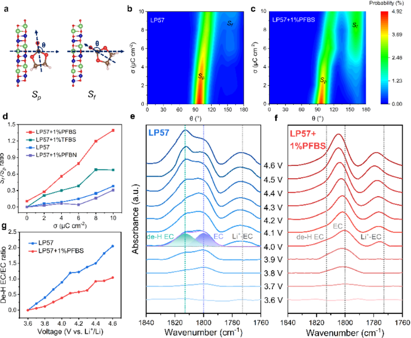 为验证PFBS对EC取向的调控效果,通过分子动力学(MD)模拟统计了EC分子的取向分布。首先定义不同取向的EC的两种状态:“平行态(Sp)”与“垂直态(Sf)”,MD结果表明在含有添加剂PFBS的电解液体系中,Sf状态的EC分子占比显著增加,证实了PFBS对EC分子取向的调控作用。原位FT-IR测试进一步验证:基准电解液体系在4.1 V以上时,C=O伸缩峰显著蓝移,出现脱氢产物信号;而PFBS体系中该峰几乎不移动,表明EC分解反应被有效抑制。