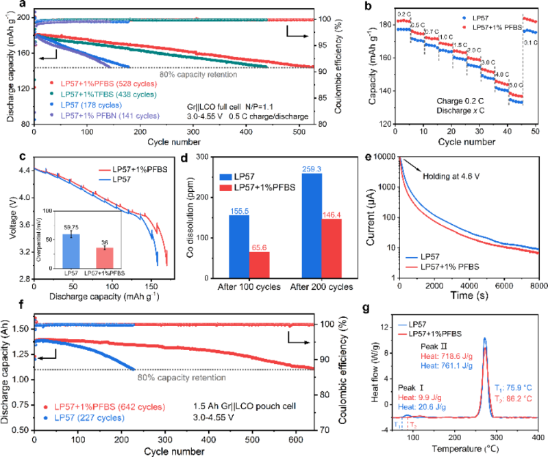 在4.55 V截止电压下,添加了仅1%PFBS的电解液,在Gr||LCO扣式全电池中表现出520次的循环寿命,远超基准电解液的178次。此外,在更接近实际应用的1.5 Ah软包电池中,其循环寿命更是达到了640次,是基准电解液(227次)的近三倍。即便在45°C高温的严苛条件下,PFBS仍能将软包电池的寿命从54次大幅提升至143次,展现了其卓越的热稳定性和实用化前景。