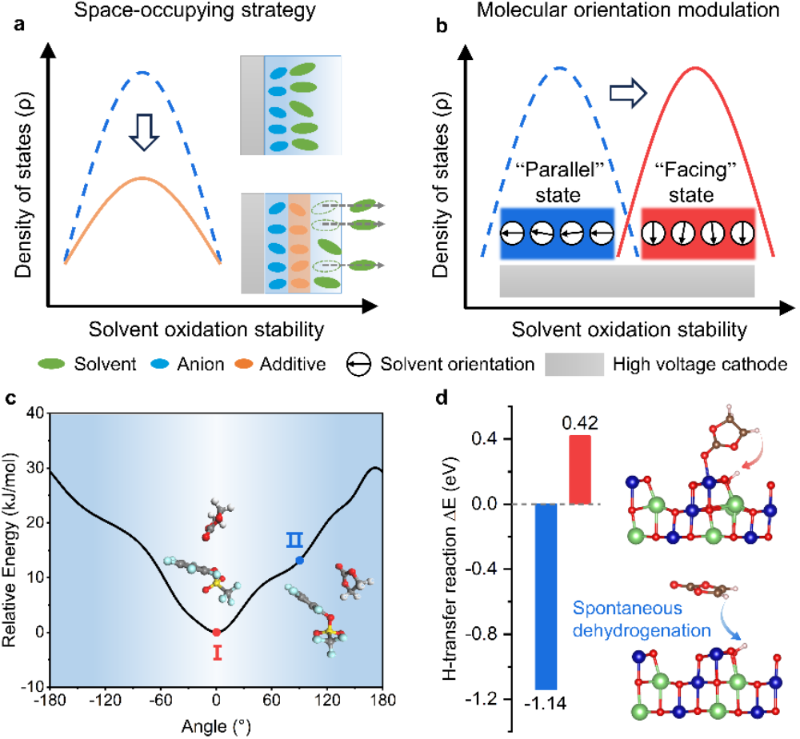 传统解决方案依赖电解质添加剂在正极表面形成钝化层,但存在两大局限:一是牺牲型添加剂难以在长循环中维持稳定的保护作用;二是忽视了双电层内溶剂与添加剂的相互作用,难以从根源抑制溶剂分解。因此,开发能精准调控界面反应、从分子层面阻断溶剂氧化路径的新策略,成为高电压锂离子电池研究的迫切需求。
