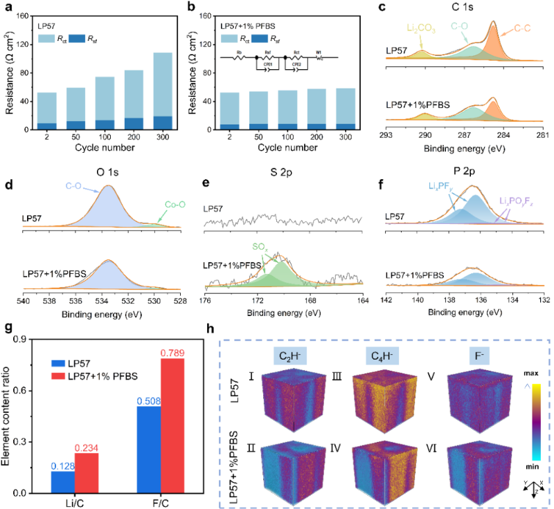 XPS分析显示,PFBS体系形成的界面膜富含无机成分(LiF、SOx等),而有机分解物(Li2CO3、C-O等)显著减少。TOF-SIMS成像结果进一步表明,PFBS体系中无机片段信号增强,而C2H-、C4H-等有机碎片减少,证实其形成了更稳定的无机CEI层。电化学阻抗谱(EIS)测试中,PFBS体系在长循环后界面电阻几乎不增加,而基准电解液体系中界面阻抗和电荷转移阻抗均显著升高,反映了PFBS体系优异的界面稳定性与离子传输性能。