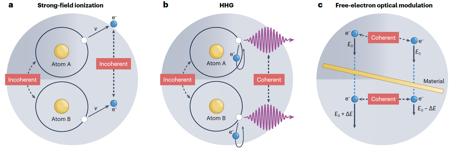空间结构光场驱动下的超快物理研究中,关键物理问题是电子的空间相干性,它决定了结构光的空间特性能否传递到电子或者高次谐波辐射(图2)。在强场电离中,电子的相位由基态初相位、隧穿与外场传播相位组成。不同原子的初始相位随机,且激光波长远大于原子尺度。因此,来自不同位置的光电子彼此不相干,电离出的光电子不保留驱动光场的空间拓扑。虽然气体高次谐波中不同电子的回碰也是非相干的,但高次谐波辐射的光子相位则是由电子回碰过程积累的相位决定的。因此高次谐波是相干辐射,可以继承驱动光的拓扑结构。研究者们在理论上和实验上提出了一系列具有特殊空间结构的极紫外拓扑光场,包括:横向光涡旋、时空光涡旋、矢量光束、自扭矩光场、项链结构光场、斯格明子、霍普夫子等。所以空间结构光场驱动下的高次谐波过程为实现极紫外光场调控提供了重要手段。