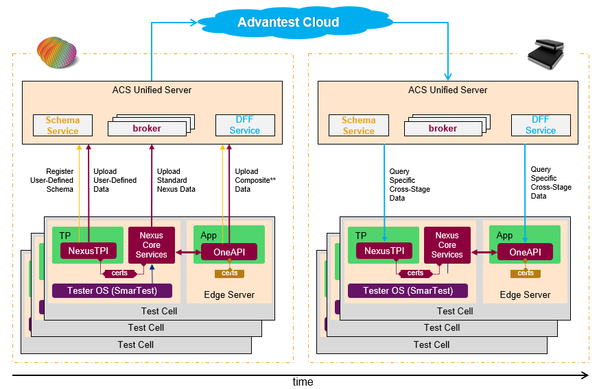 2.数据流转:所有数据在 ACS Unified Server 中根据用户设定的规则进行筛选,并按需前馈到后续测试阶段或反馈到前段流程。例如,上图中晶圆测试数据被传递到封测厂的服务器。