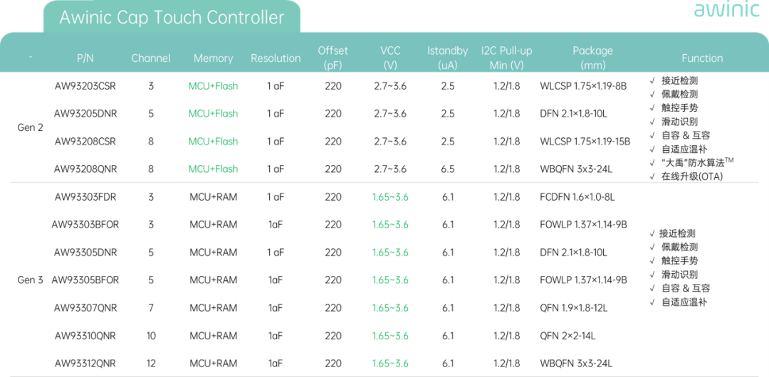 随着AI智能眼镜、OWS耳机、手机等电子设备的快速演进,轻薄化成为各家品牌厂商的关键竞争力。艾为推出的第3代高灵敏度可编程电容触控芯片AW933XX已经成熟量产,累计出货量突破2000万颗,该系列采用创新的自互容一体电容感应技术,具有高灵敏度、强抗干扰、低动态功耗等优点,实现精准触控手势识别和可靠的人体佩戴检测。