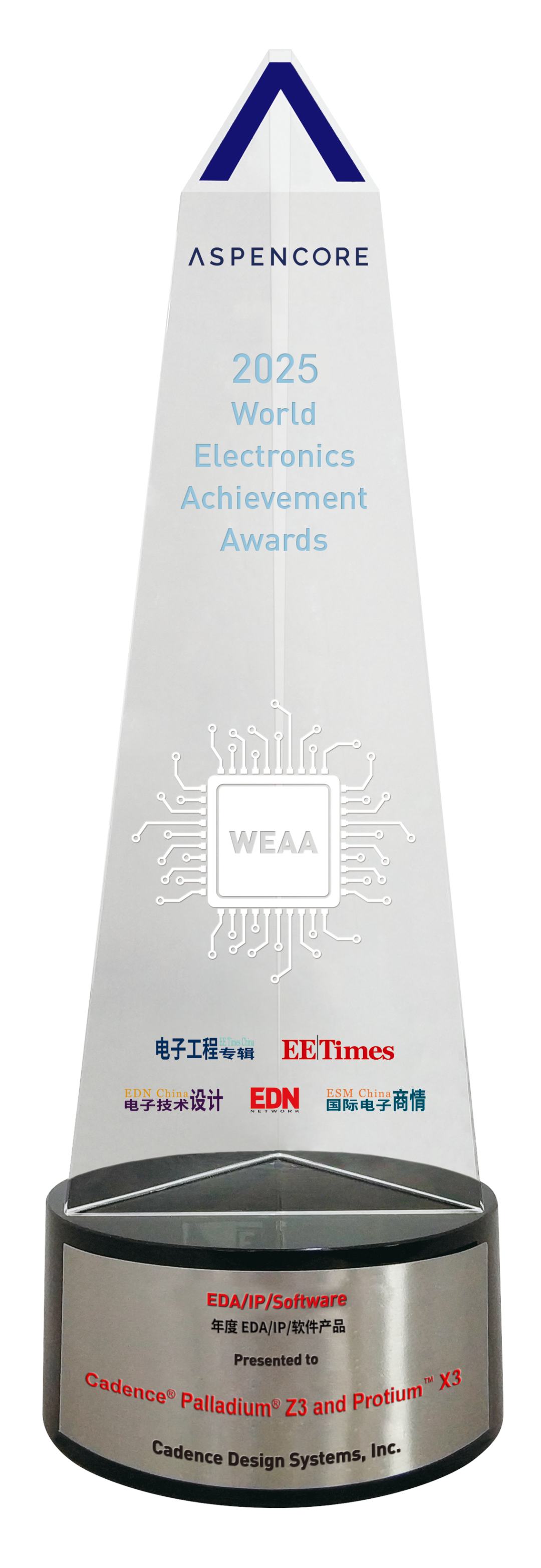 由全球电子技术领域知名媒体集团 ASPENCORE 举办的全球电子成就奖颁奖典礼于 2025 年 11 月 25 日 在深圳盛大举行。Cadence 旗下的 Palladium Z3 硬件仿真系统与 Protium X3 FPGA 原型验证系统荣膺 2025 全球电子成就奖(World Electronics Achievement Awards, WEAA)之“年度 EDA/IP/软件产品”奖项。