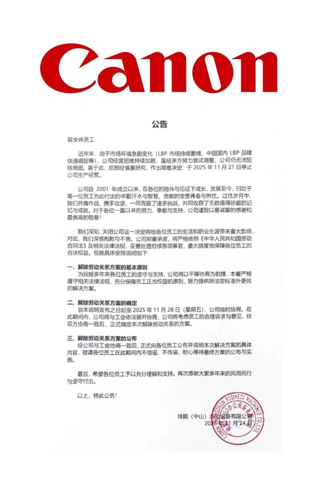 11月26日,Canon佳能(中山)办公设备有限公司停止运营的公告在网络上曝光。该公告指出,公司因经营环境发生重大变化,决定终止生产经营活动并正式关闭。