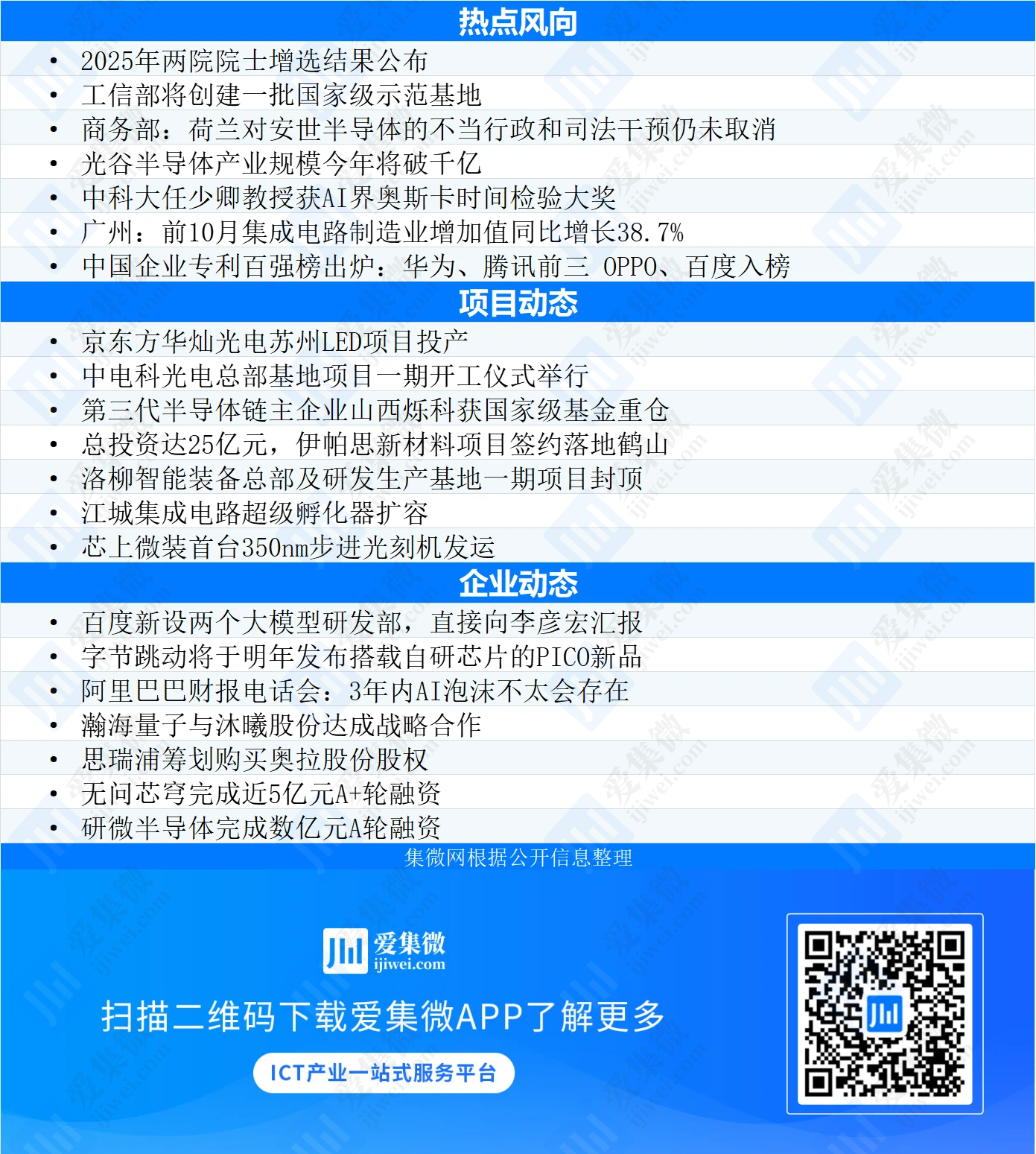 本周以来,2025年两院院士增选结果公布;工信部将创建一批国家级示范基地;中国企业专利百强榜出炉;京东方华灿光电苏州LED项目投产;第三代半导体链主企业山西烁科获国家级基金重仓;百度新设两个大模型研发部;字节跳动将于明年发布搭载自研芯片的PICO新品……
