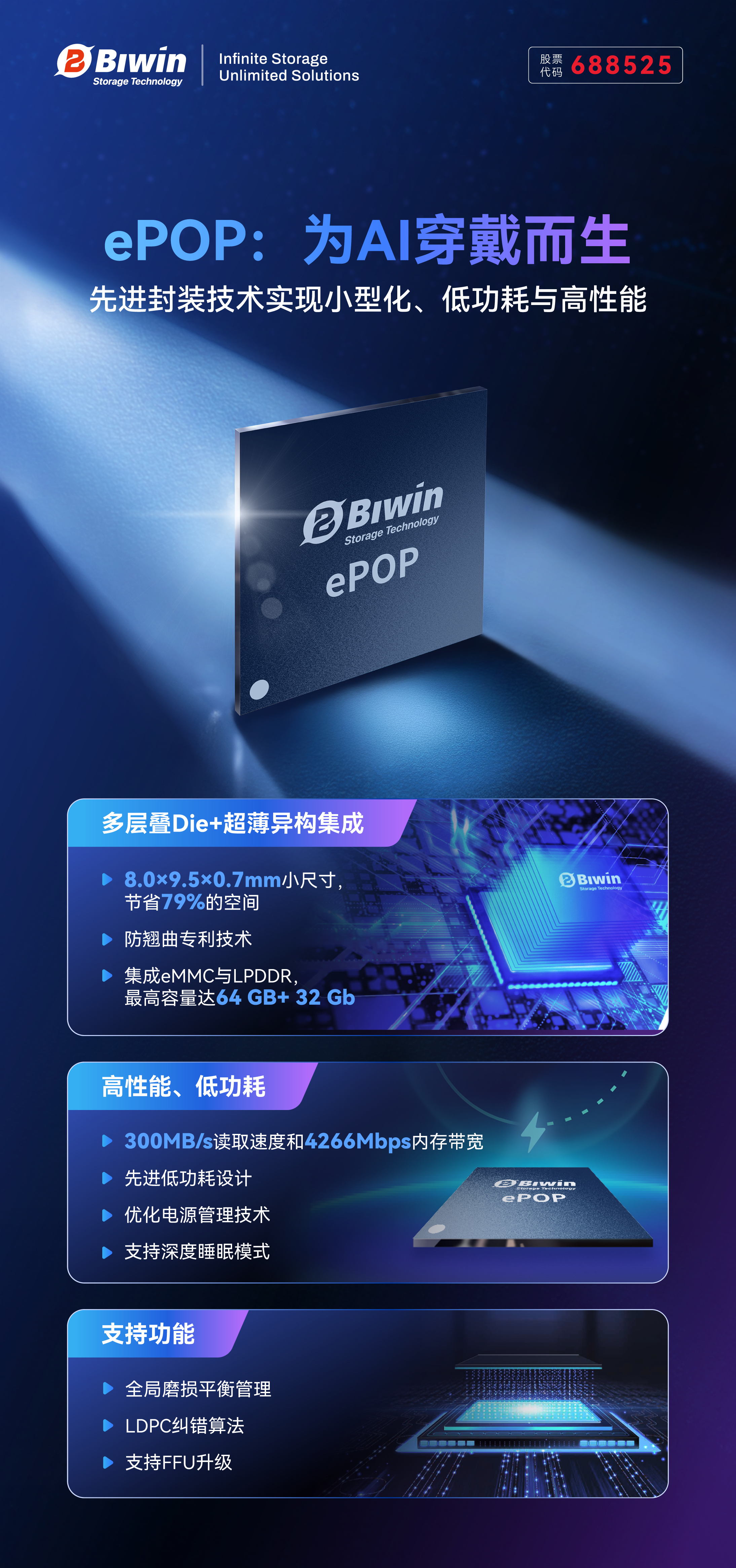 ePOP则专为AI穿戴场景打造,采用多层叠Die、超薄Die及多芯片异构集成等先进封装工艺,将eMMC与LPDDR内存垂直集成于单一封装体,整体尺寸仅8.0mm × 9.5mm,厚度低至0.6mm,是目前业内最轻薄的嵌入式存储解决方案之一,不仅大幅节省PCB空间,还有效缩短信号传输路径,提升带宽效率并降低系统功耗。产品在读取速度达300MB/s、内存频率达8533Mbps的高性能下,功耗仍控制在500mW以内,有效延长终端续航。针对超薄芯片在高温制程中易翘曲的行业难题,佰维通过自研知识产权与多项发明专利技术,显著提升封装平整度与结构稳定性,确保产品在长期高负载运行下的高可靠性。
