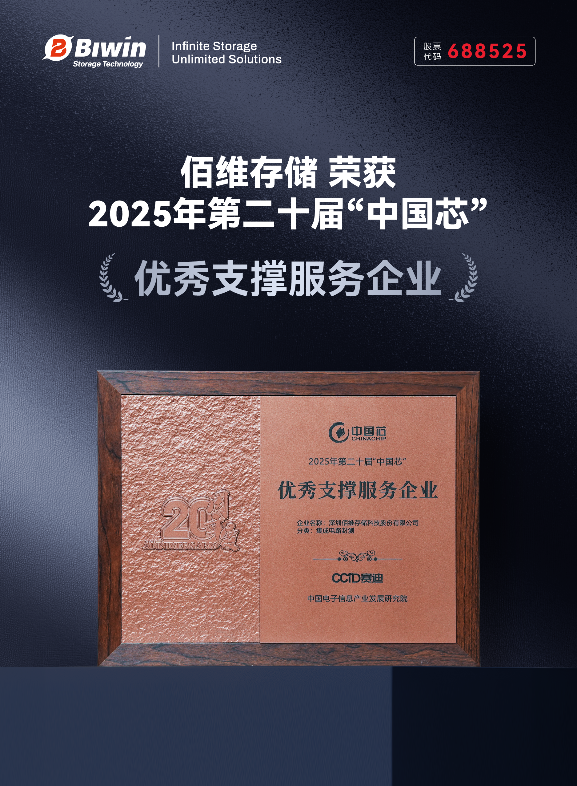 近期,由工业和信息化部指导,中国电子信息产业发展研究院(简称:赛迪研究院)组织承办的第二十届“中国芯”优秀产品征集结果正式发布,佰维存储荣获2025年度“‘中国芯优秀支撑服务企业称号,公司已连续两年蝉联该奖项。“中国芯”优秀产品征集是国内集成电路领域最具影响力和权威性的行业评选之一,佰维两次登榜,不仅体现其在先进封测技术上的持续创新能力,更彰显了公司在推动产业生态协同与高质量发展中的关键支撑作用与卓越贡献。