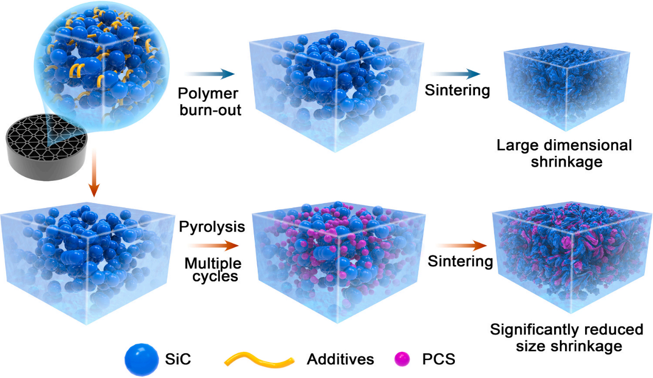 碳化硅陶瓷结构件在半导体制造、新能源等高端装备领域的需求日益增长。然而,碳化硅陶瓷因极高的硬度和显著的脆性,使其难以通过传统加工方法制造复杂结构件,这一技术瓶颈制约了其在高端装备中的应用。因此,3D打印技术成为突破碳化硅陶瓷制造瓶颈的关键途径。目前,3D打印方法制备的碳化硅陶瓷主要面向缺陷容忍度较高的反应烧结碳化硅陶瓷,但反应烧结碳化硅陶瓷中通常存在>30vol%的残余游离硅,硅熔点低于1410℃,导致其高温性能受限,进而限制了3D打印碳化硅陶瓷在极端服役环境下的应用场景。