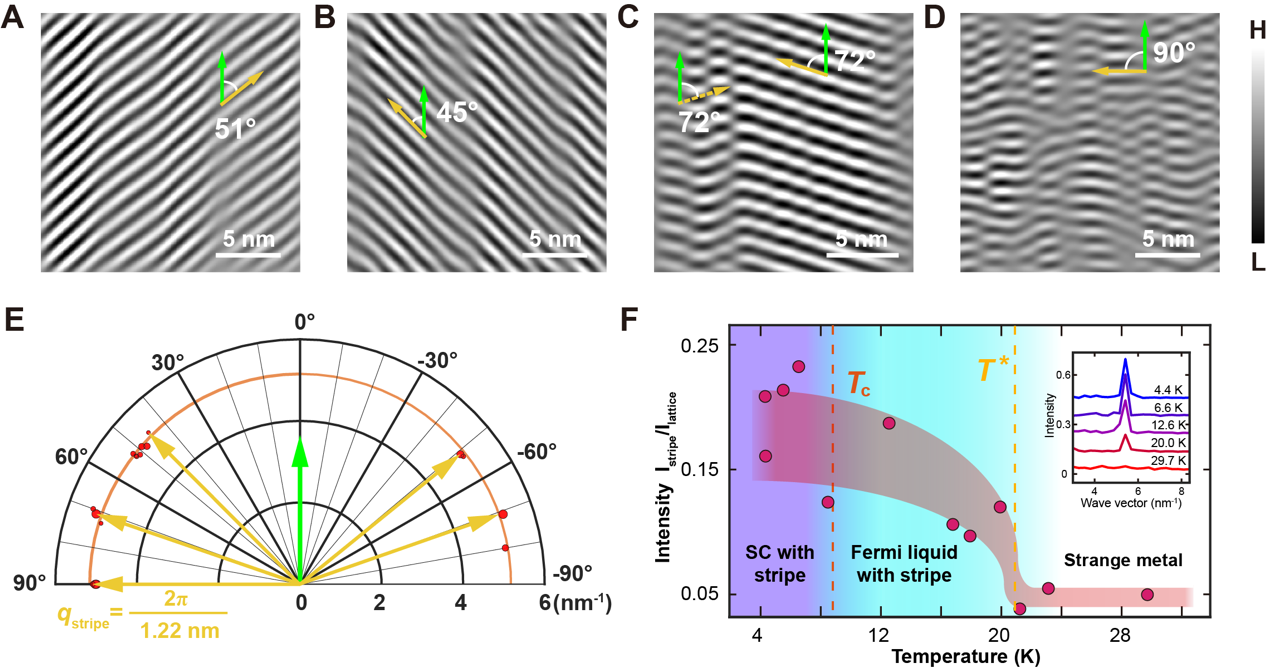 (A-D)不同方向的条纹电荷序。(E)条纹电荷序的方向与波矢统计。(F)电荷序的温度演化及相图。T*为电荷序的相变温度