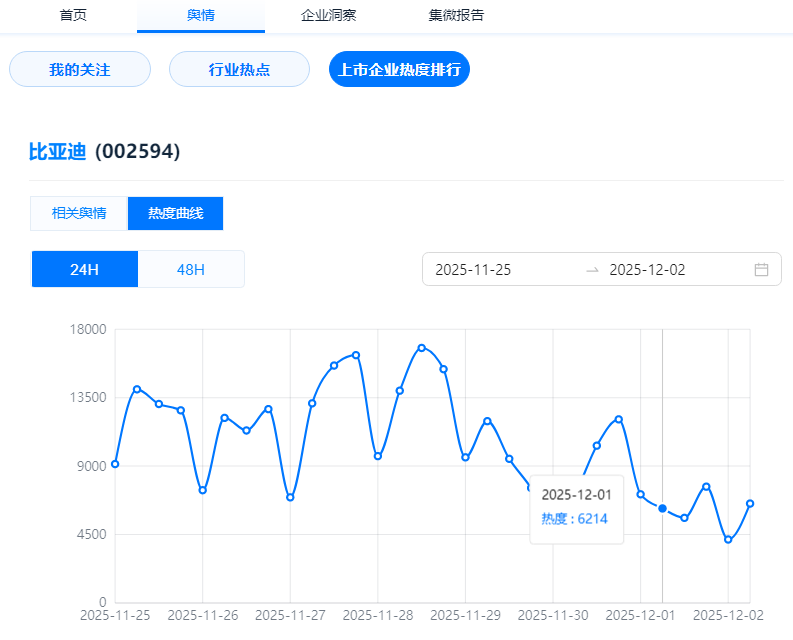 趋势可视化,脉络清晰可见:基于用户所关注的“关键词”,系统将自动生成对应的热度指数曲线,直观展示企业、技术或赛道在一段时间内的舆情走势与关注度变化。信息流负责精准触达,曲线图专注趋势洞察,两者协同,助您既把握实时动态,又看懂长期脉络。