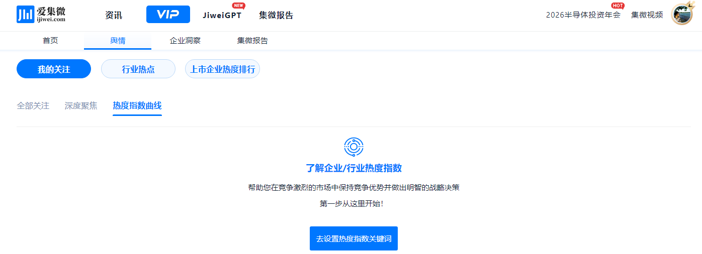 在信息爆炸的时代,如何从海量资讯中快速捕捉市场关注焦点、追踪企业舆情走势,已成为投资决策与产业分析的关键能力。爱集微VIP频道今日正式上线两大舆情监测新产品——“上市企业热度排行”与“我的关注-热度指数曲线”,旨在用户提供更精准、更动态、更具深度的舆情洞察工具。