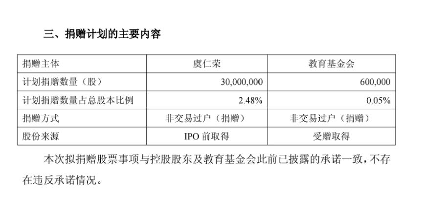 公告披露,其中虞仁荣拟捐赠3,000万股豪威集团无限售条件流通股,占公司目前总股本的2.48%;宁波市虞仁荣教育基金会拟捐赠60万股,占公司总股本的0.05%。以12月2日公司收盘价121.08元/股估算,本次捐赠对应市值超过37亿元。